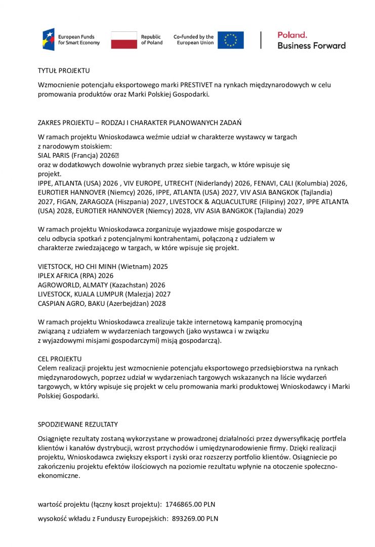 PRESTIVET is implementing a strategic project aimed at strengthening the company’s export potential on international markets through the promotion of its products and the Polish Economy Brand. The initiative supports the long-term development of PRESTIVET by increasing its international visibility and reinforcing its position in global markets.